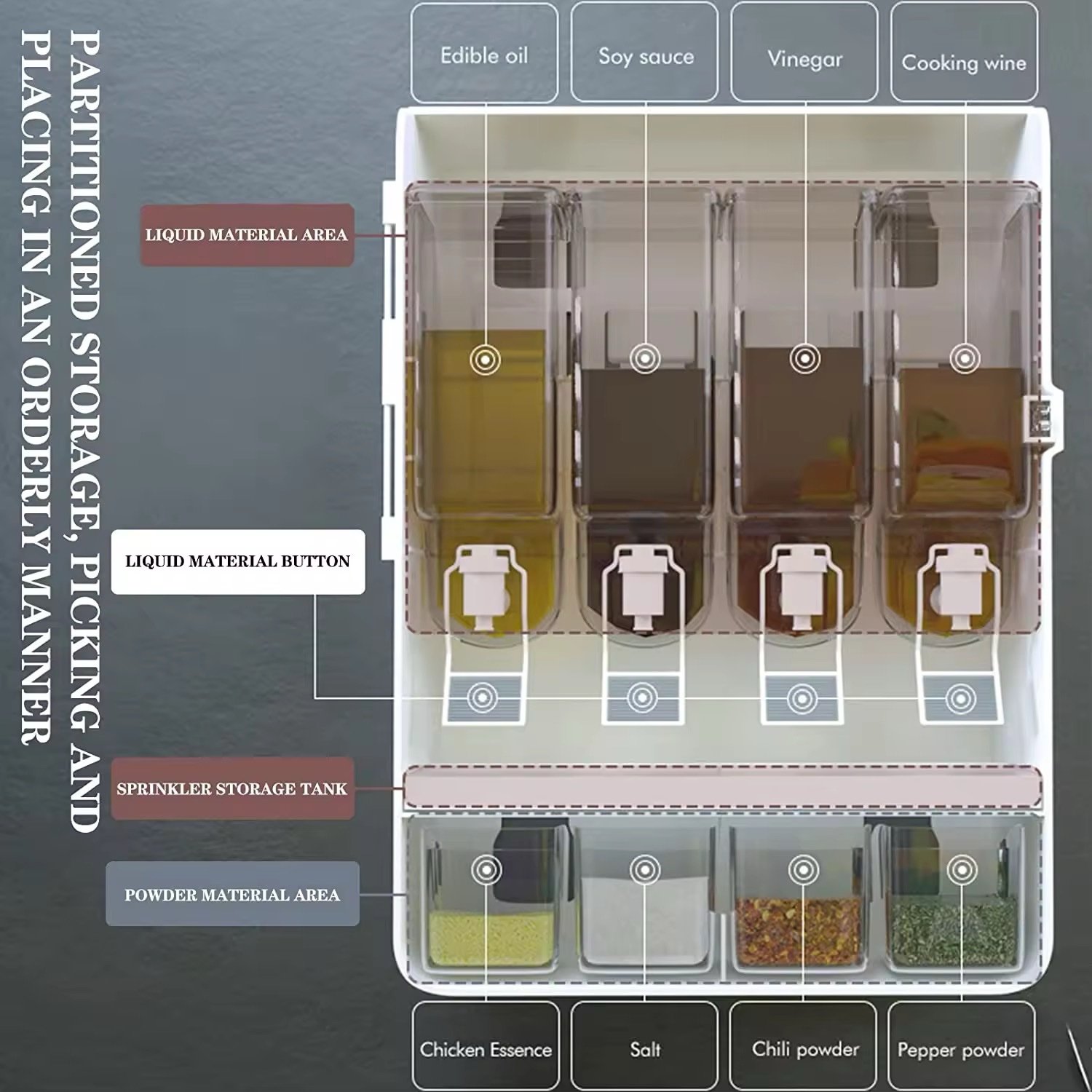 C1D6102B-1E2A-4761-911C-153BC77C1870La boîte murale multifonction pour condiments est l’outil indispensable pour une cuisine ordonnée et efficace. Elle combine ingénieusement 4 compartiments pour condiments liquides (huile, sauce soja, vinaigre, vin de cuisson) avec 5 récipients pour condiments secs (sel, poivre, piment, etc.).