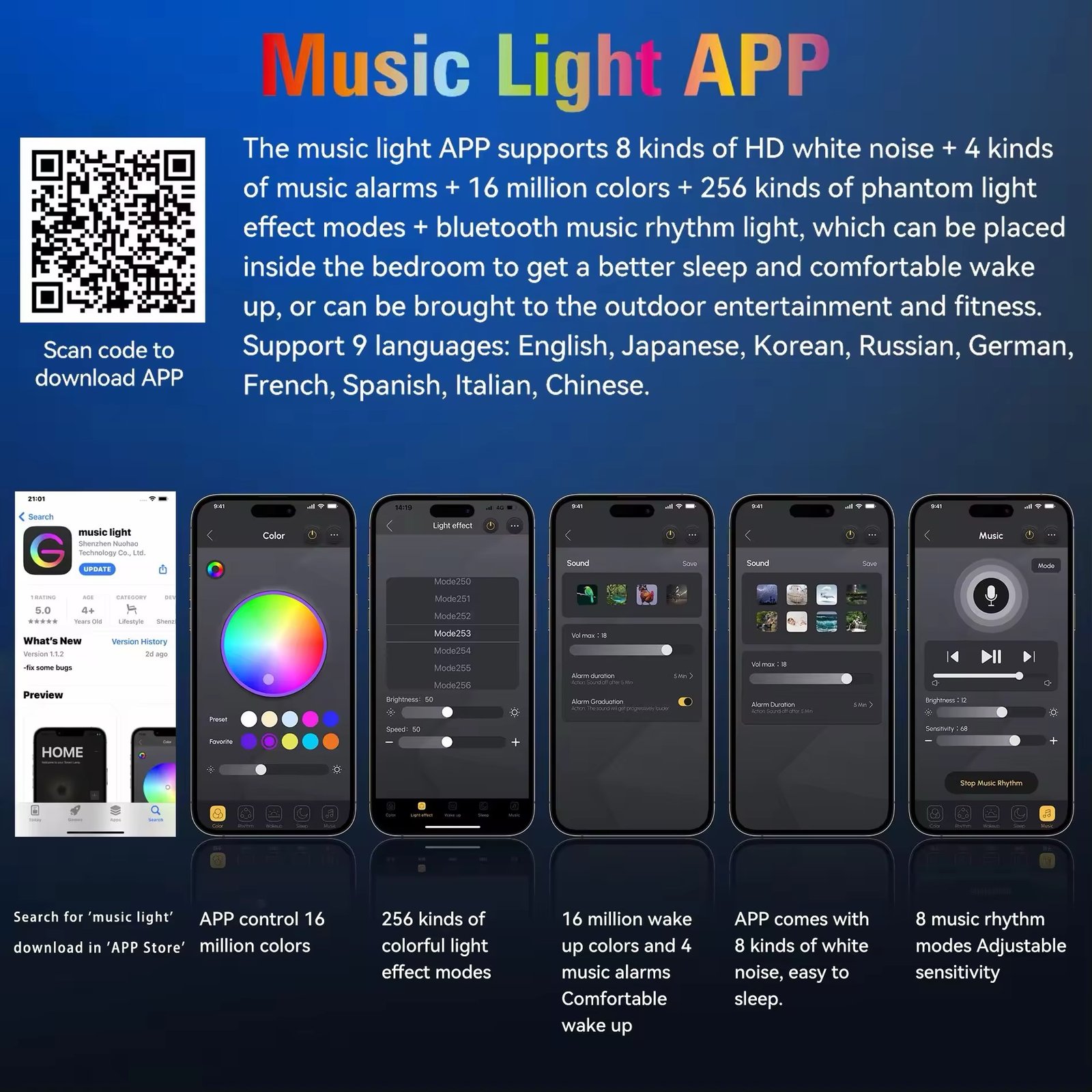 Connecté à une application mobile via Bluetooth, il vous permet de personnaliser jusqu’à 16 millions de couleurs et 256 modes d’éclairage. Profitez également de 4 alarmes musicales, d’un haut-parleur Bluetooth, de deux alarmes simultanées et d’une fonction de charge sans fil pour votre smartphone.