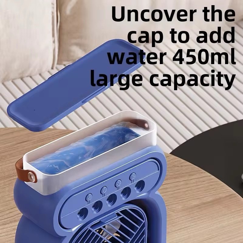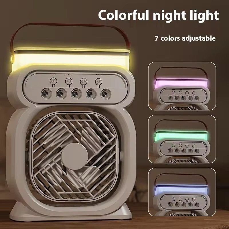 Restez au frais et profitez d’un confort optimal avec ce ventilateur brumisateur portable 3-en-1. Compact et élégant, il combine un ventilateur à 3 vitesses puissantes, un brumisateur à 5 buses pour une humidification efficace et une veilleuse LED multicolore à 7 teintes pour une ambiance agréable.